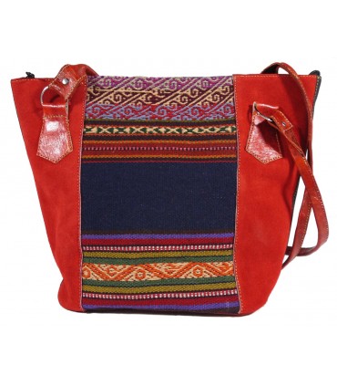 Sac à anses en peau de vachette, ornement en tissage de laine de mouton (Pallay) typique de la ville de Cusco, pochette extérieure dos à zip, doublure intérieure polyester. Fermeture à zip. Dimensions : hauteur 24 cm, largeur 32 cm ; longueur anses 68 cm. Fait main par l’artisan Daniel Condori.
