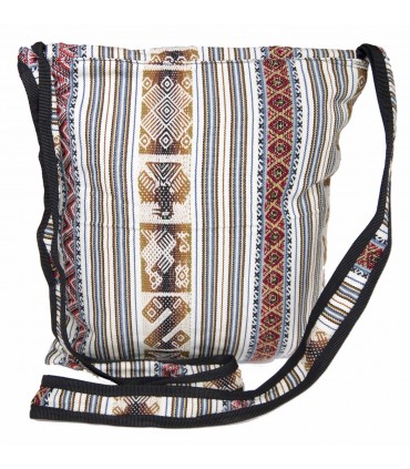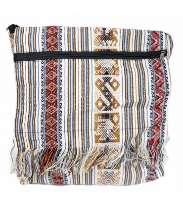 Sac à bandoulière à fermeture principale à zip typique, utilisé par les porteurs de courrier Inca « Chaski », à large rabat zippé transformé en poche. Tissage résistant, reproduction « Manta », doublé de tissu polyester à l’intérieur. Largeur : 31cm, hauteur : 35cm. Fait main.